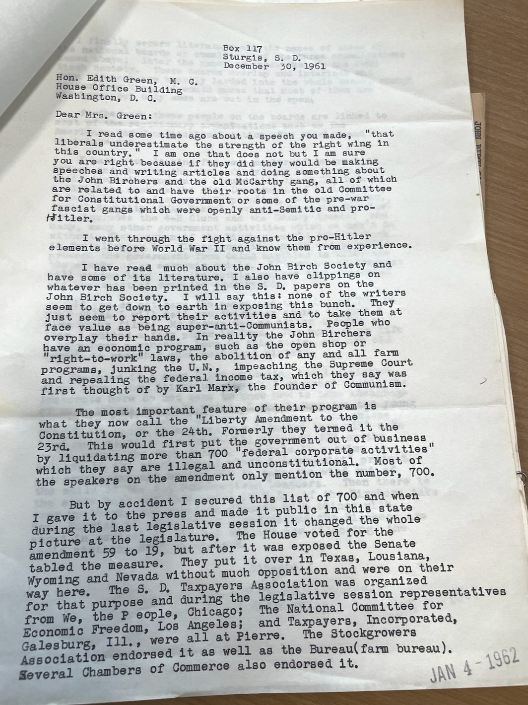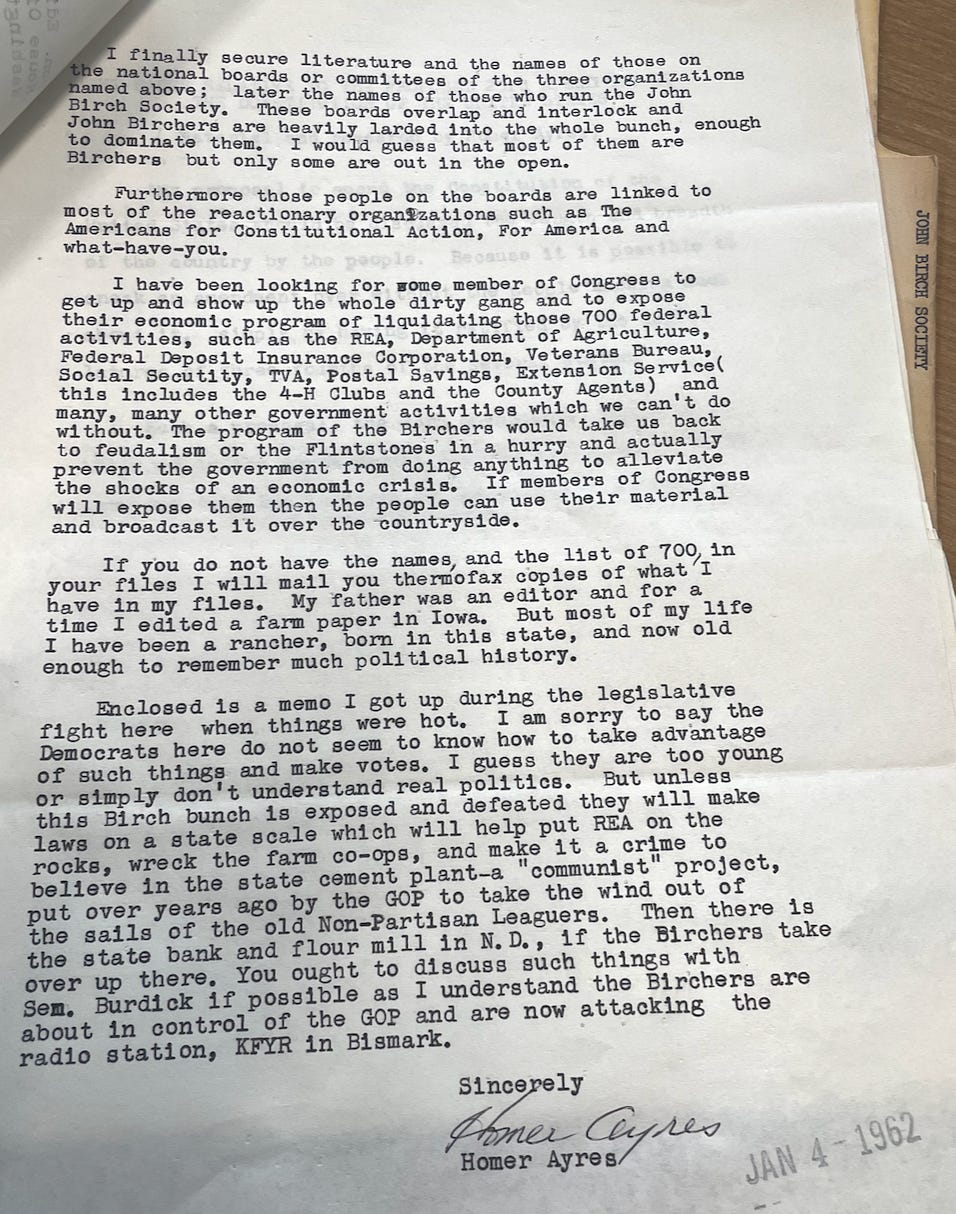 Because Edith Green became such a target for and critic of the far right in 1961-2, she received a barrage of letters on the topic. The ones from supporters of Huss and the John Birch Society expressed whiny outrage at her unfair persecution of such noble truth-telling patriots. Those letters are all fairly predictable. But the most interesting letter I found in Green’s papers was from Sturgis, SD rancher Homer Ayres (1899-1992).