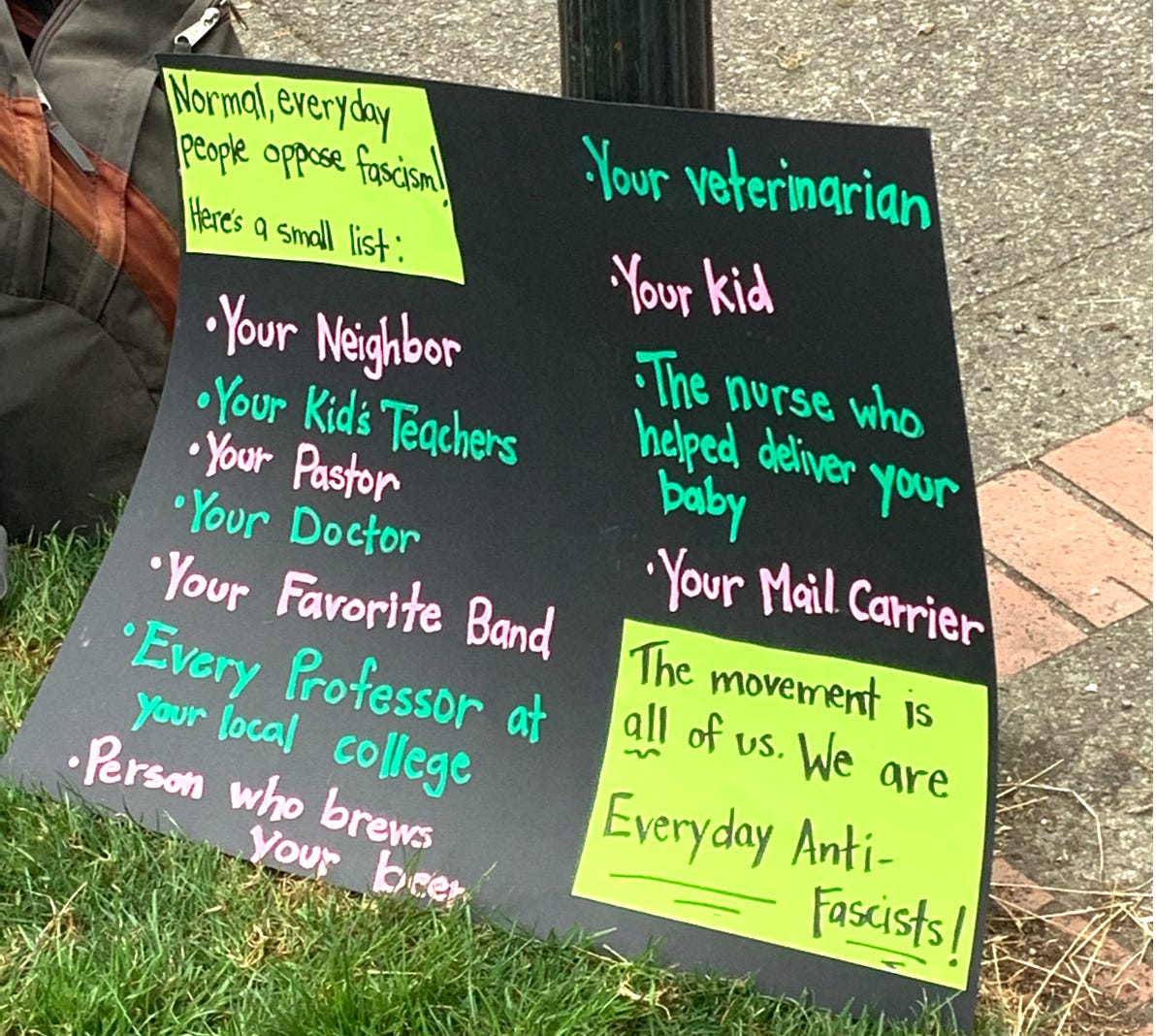 A sign I saw on August 17, 2019 at the counter protest to the Proud Boys’ invasion of Portland.