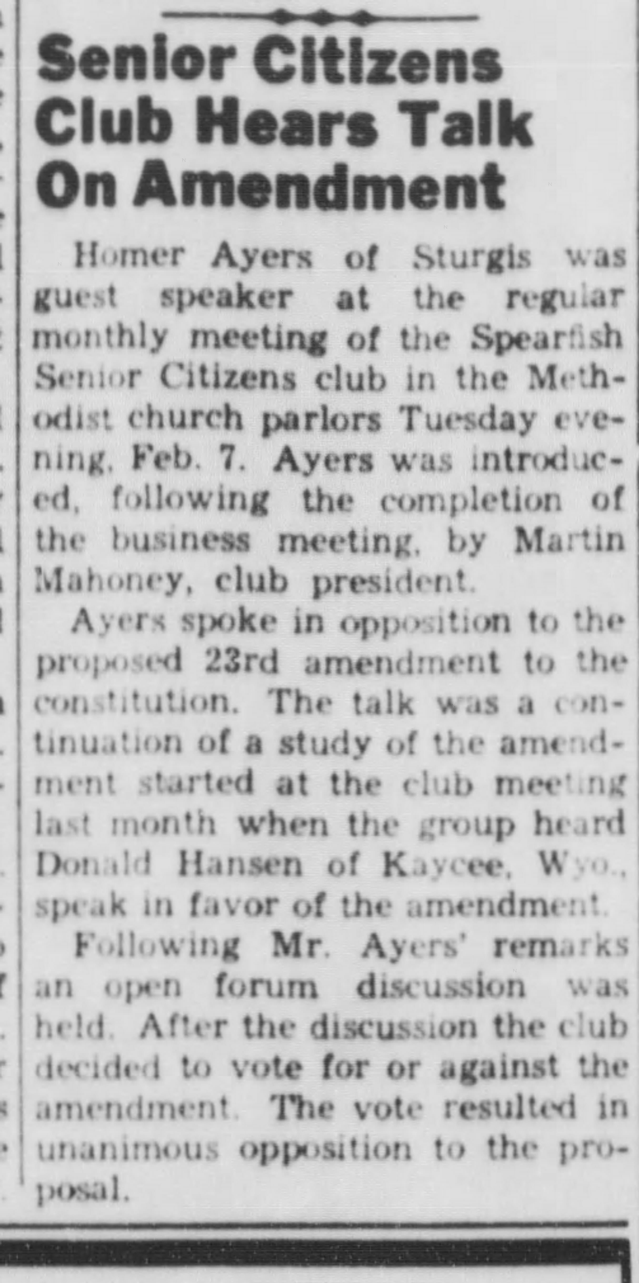 Ayres was a local antifascist activist who walked the walk. He assiduously read the newspaper and kept research files on the creeping fascist threat. More than that, he put his research to use in informing his fellow citizens. The previous year a Methodist Senior Citizens club 20 miles NW of Sturgis had hosted a speaker in favor of the Birch-supported Liberty Amendment. This amendment would have eliminated the federal income tax and essentially defunded the majority of the federal government except for the military. Ayres showed up the following week to offer the opposing view, and when this group of South Dakota Methodist Senior Citizens took a vote on the matter they unanimously sided with Ayres. If supporters of democracy were going to beat back the fascist creep, the battle had to be engaged not just at the national level, but at the local level as well, one South Dakota senior citizens’ club at a time.