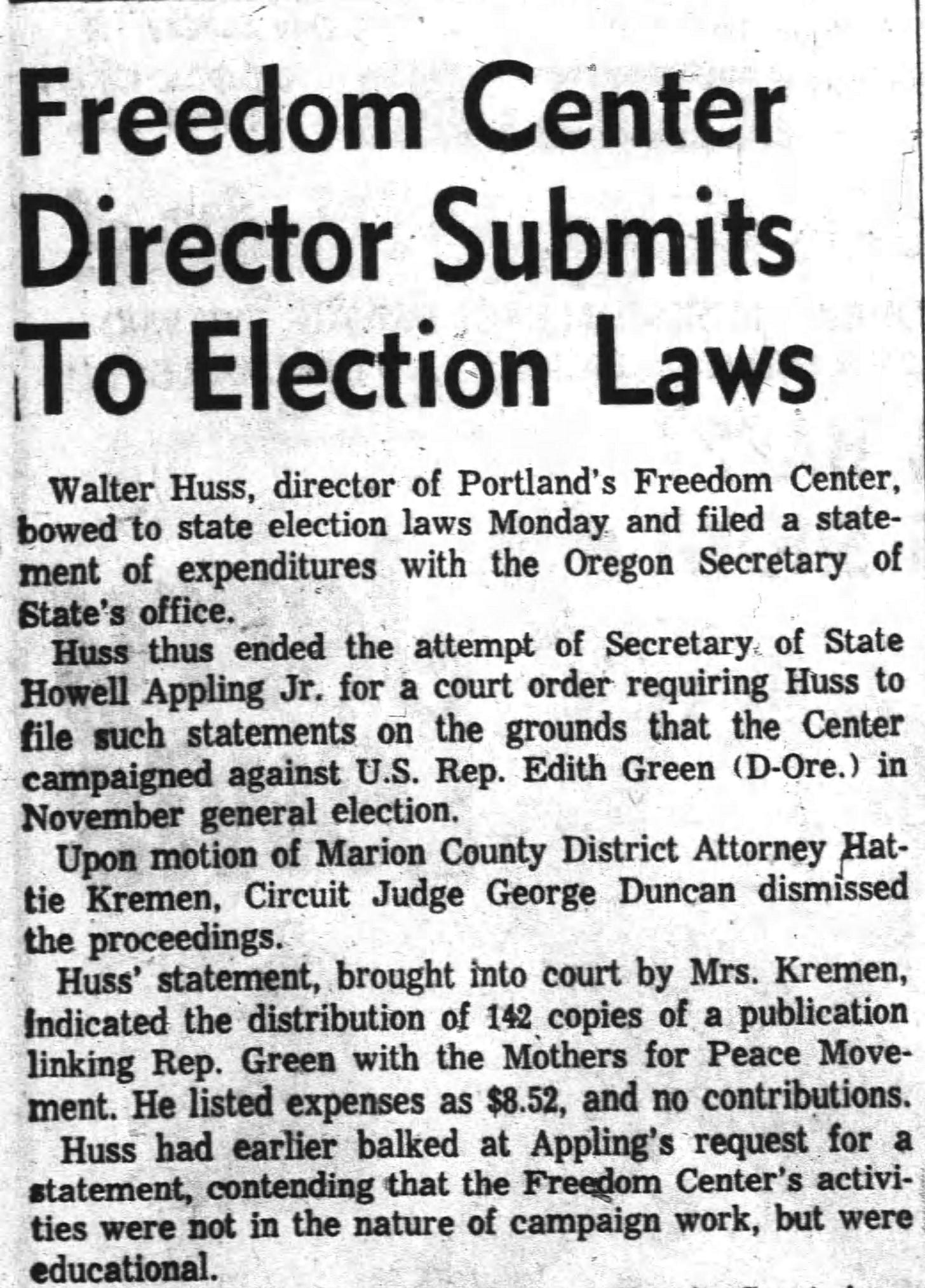 In 1961-2 Edith Green found herself the target of wild accusations being thrown at her from people and organizations she had never heard of before. She wrote letters to various organizations in Portland trying to figure out what the hell was going on. Eventually she pushed back against her far right tormenters in a variety of fairly gentle ways, one of which involved collecting information on the contemporary far right in Portland to put on the Congressional Record. She also got Oregon’s Republican Secretary of State, the Goldwaterite conservative Howell Appling, to investigate whether Walter Huss had broken the law by engaging in political activities under the supposedly “educational” auspices of fighting Communism.