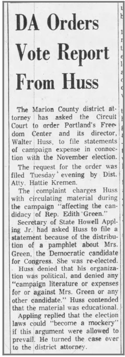 Huss eventually admitted to spending $8.52 to print up anti-Edith Green leaflets and the case was dropped. I think this investigation was intended to teach Huss a lesson about the legal consequences of engaging in political activity under the cover of his supposedly “anti-communist” educational organization, but LOL, this was Walter Huss so that lesson was definitely not learned. If anything, it just fed the persecution complex that fueled his angrily manic political activities. [In a pattern that would repeat multiple times over the years, Huss tried to get revenge against Green in 1964 by running in the GOP primary to be her opponent in the general election. And in another pattern that would repeat, Huss lost that primary election. The winning primary candidate, who then got shellacked by Green in the general, got 27K votes to Huss’s 21K.]