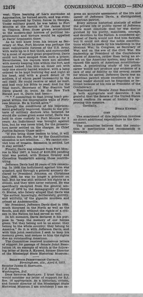 I want to end with a different but related example of fascist-friendly historical memory from the 1970s, and that’s the time the US Congress unanimously voted to posthumously restore Jefferson Davis’s citizenship. One mind-blowing thing I learned from this excellent podcast on the topic was that one of the lead sponsors of this move in the US Senate (along with Strom Thurmond and Orrin Hatch, both likely suspects) was none other than Oregon Senator, respected “moderate Republican,” and lifelong champion of civil rights, Mark Hatfield. Hatfield gave this outrageously whitewashed speech about Jefferson Davis THE EXACT SAME WEEK that the nation’s attention was riveted by Roots, a show that told the history of slavery from the perspective of the enslaved for the first time ever on a major network. There was never a good moment for a self-described champion of Black civil rights like Hatfield, or really anyone, to give a speech on the Senate floor praising the “purity, manliness, courage, and devotion to the nation” exhibited by unrepentant seditionist and white supremacist enslaver Jefferson Davis. But as moments went, late January of 1977 was pretty much the most inappropriate one imaginable.