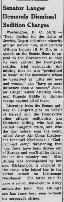 The "Liberty Lobby" of which Kirkpatrick was a member was run by a neo-Nazi named Willis Carto who in the 1980s founded the world’s leading journal of Holocaust denial. Carto was also known to host celebrations of Hitler’s birthday in the Liberty Lobby’s DC office. It’s pretty gobsmacking that Kirkpatrick, who expressed his “patriotism” by contributing to Carto’s Liberty Lobby, worked in the "de-Nazification" field for the US government. And can we also pause for a moment to note that the war department chose Kirkpatrick Dilling to be involved with de-Nazification efforts AT THE SAME TIME that his mother, whose politics he shared, was on trial for SEDITION for being a viciously antisemitic pro-Nazi organizer of opposition to the US government? I highly suspect that Dilling’s approach to de-Nazification might have been better characterized as “re-Nazification.” This vignette that appeared in the September 1944 edition of The Southern Jewish Monthly, gives you a little flavor of Elizabeth and Kirkpatrick’s attitude toward Jewish Americans.