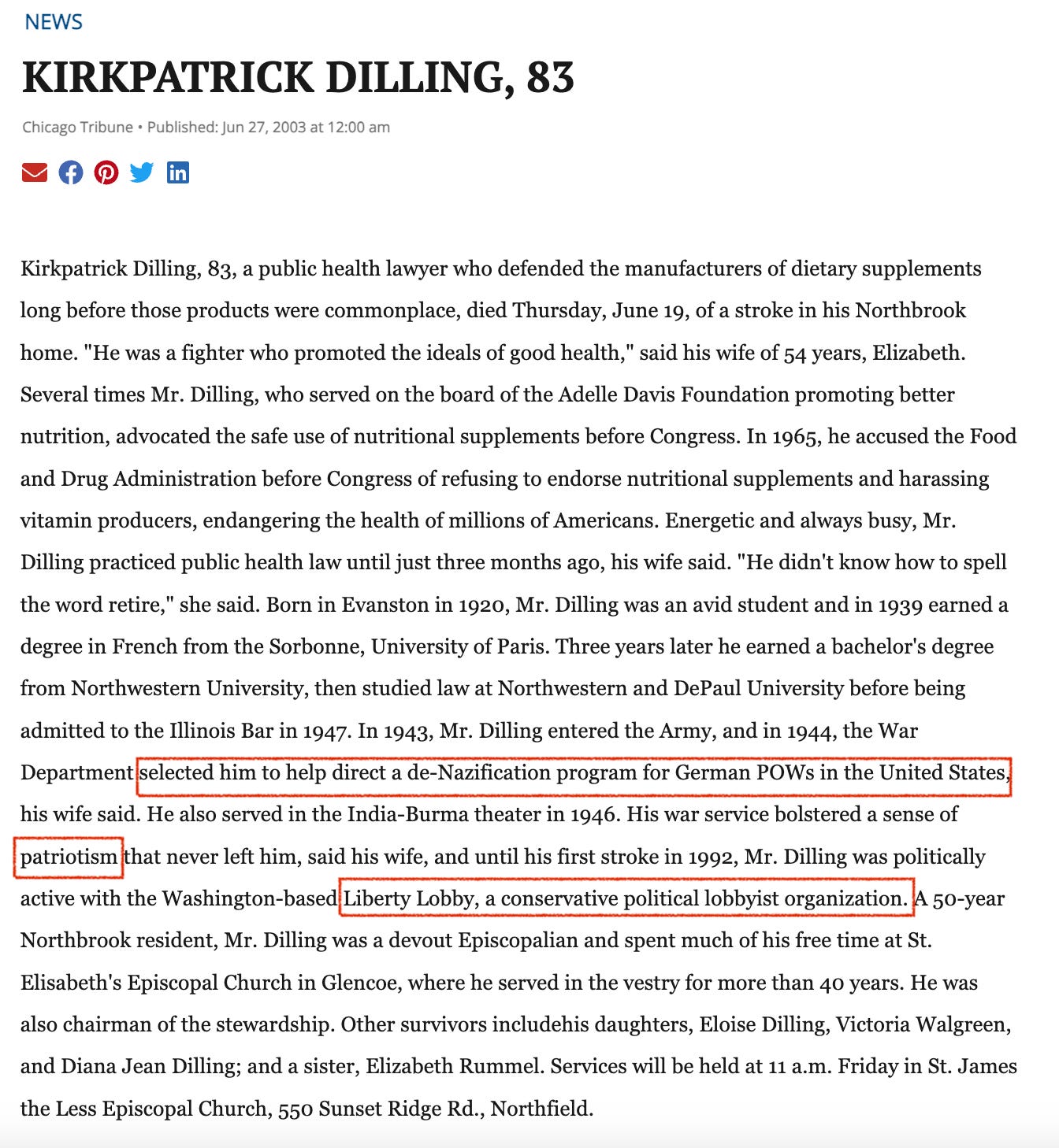 The history of American fascism that formed an important backdrop to Kirkpatrick Dilling’s life remained entirely buried below the surface of that obituary’s text, unless of course one happened to be the rare reader who would have recognized that “Dilling” last name and/or knew what the innocuously-named Liberty Lobby was.