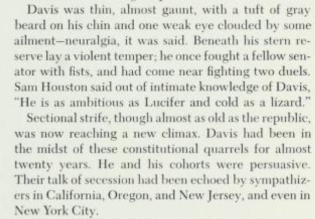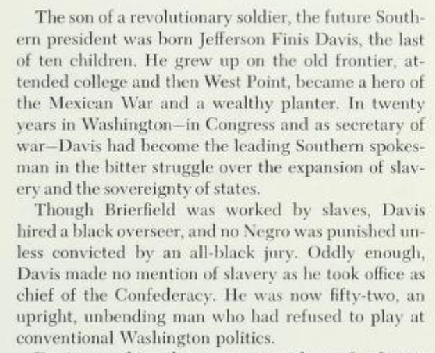 This account of Jefferson Davis, the kind enslaver who reluctantly entered into the war, sounds a lot like Hatfield’s tribute to Davis, the great American man of principle who was unfortunately forced into a position where he had to make his living off the violently coerced labor of others and then was forced to lead the seceded states into a seditious war in which 600,000 Americans tragically perished. Mistakes were made, but it’s all behind us now so let’s let bygones be bygones.