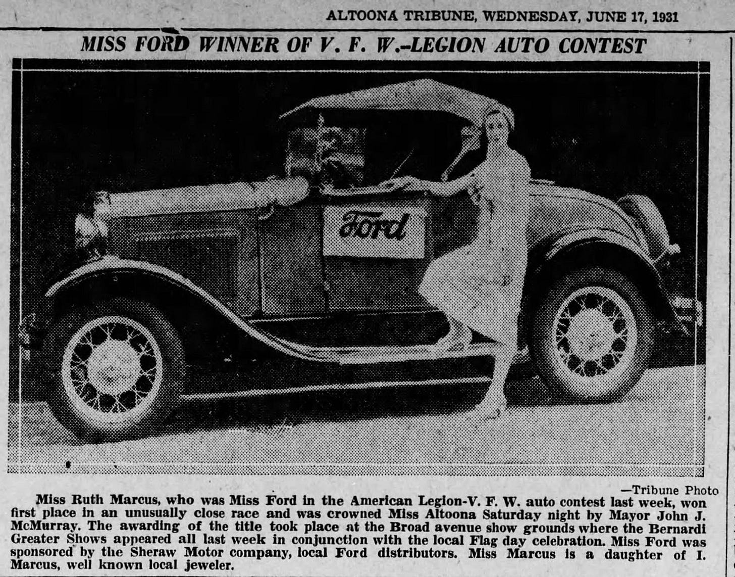 And also, I take great pride in knowing that when my grandmother was named Miss Altoona in 1931, she was sponsored by one of that antisemite’s dealerships. Again, take that Mr. Ford.